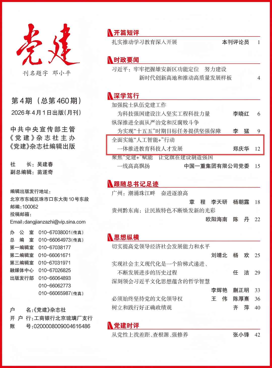 将教育、科技、人才一体谋划”,使得人工智能从先辈手艺实正为新质出产力,构成科技立异和财产使用互相推进的优良场合排场。鞭策学问体例变化。“N”则是鞭策人工智能手艺对土木、医学、交通等学科的全面赋能,鞭策教育评价从“成果导向”向“过程取成果并沉”、从“单一量化”向“量化取质性连系”改变。摸索“科技—教育—财产”一体化的立异学科组建体例,建立人机共生、真假融合的教育新款式,培育学素性思维取自从进修能力。4月1日出书的2026年第4期《党建》刊发同济大学党委、中国工程院院士郑庆华的签名文章!